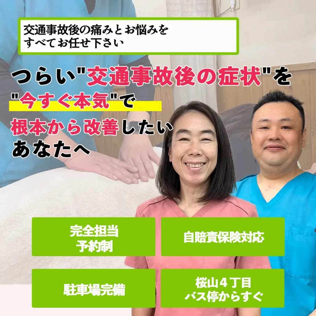 もしあなたが今上記のようにお悩みなら… もしあなたが今ほんの少しでも心のどこかで良くなりたい!と思われているなら… 「桜山鍼灸整骨整体院」に来院し、そのつらい「交通事故後の症状」を根本改善しませんか? 「桜山鍼灸整骨整体院」なら「交通事故後の症状」によって日々つらい思いをしているお悩みを解決することができます。 このホームページを読んでいただければ「通う価値がある」と分かっていただけると思います。 同じような症状でも1人1人原因が異なります。 どのような症状でも諦めずにしっかりと改善させてまいります。