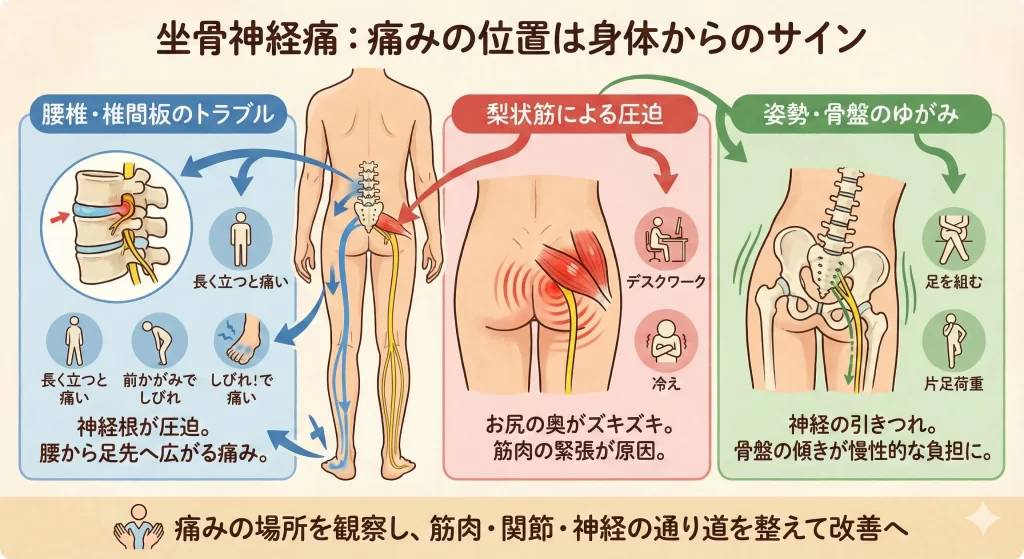 坐骨神経痛といっても、痛みの出方や感じ方は人それぞれです。お尻にズキッとくる方もいれば、ふくらはぎや足先がしびれる方もいます。痛みの場所や強さが違うのは、神経がどの位置で圧迫されているかによるものです。つまり、「どこが痛いか」を知ることは、原因を特定し、正しいケアを始めるうえでの第一歩となります。