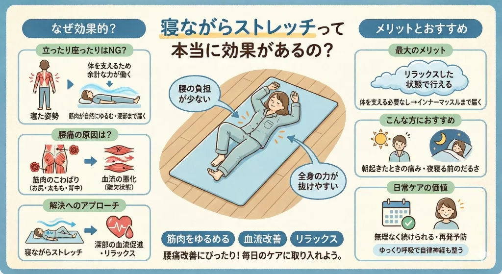 - 寝ながら行うストレッチは、腰への負担を減らしながら筋肉をゆるめる効果的な方法である。