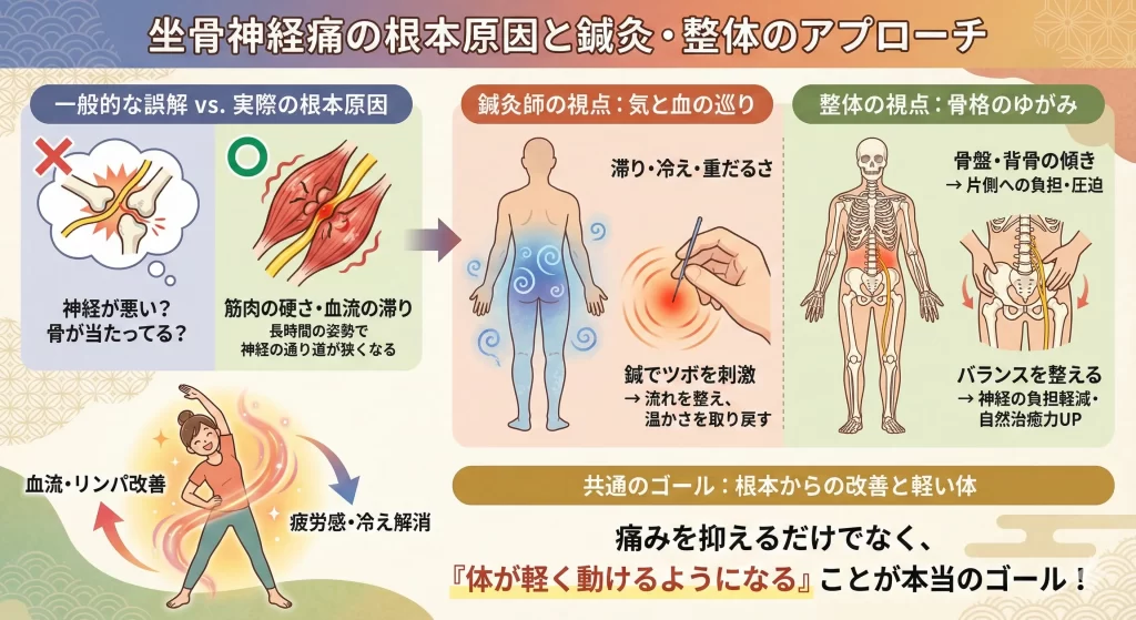 鍼灸師の視点から見ると、坐骨神経痛は「気(エネルギー)と血の巡り」が滞っているサインでもあります。腰やお尻、脚に冷えや重だるさを感じる方は、血流が滞り、神経が過敏になっている可能性があります。鍼でツボを刺激することで、滞っていた流れを整え、体の内側から温かさと柔らかさを取り戻すことができます。これは薬では届かない、身体の“奥のバランス”に働きかける方法です。