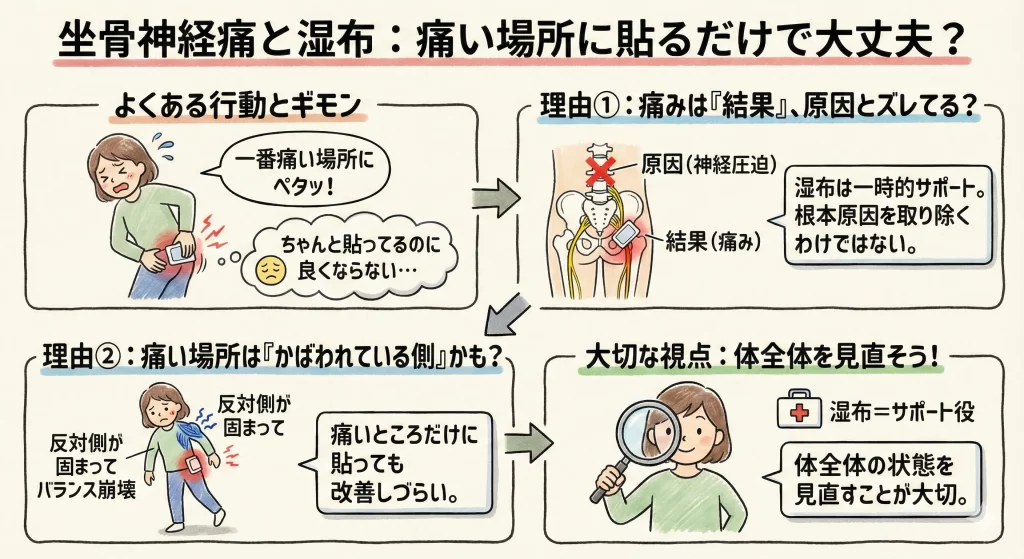 また、痛みが強い場所ほど、実は「かばわれている側」であることも少なくありません。例えば、反対側の腰やお尻が固くなり、体のバランスが崩れた結果、症状が出ているケースもあります。そうした場合、痛いところだけに湿布を貼り続けても改善しづらくなります。湿布はあくまでサポート役であり、体全体の状態を見直す視点を持つことが、坐骨神経痛と向き合ううえでとても大切です。