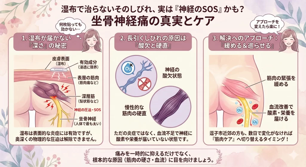 なぜ湿布だけで解決しないのか、その大きな理由は坐骨神経の「深さ」にあります。坐骨神経は人体の中で最も太い神経であり、その通り道はお尻の非常に深い層(梨状筋などの下)を通っています。市販の湿布に含まれる有効成分が到達できる深さには限界があり、神経の根元で起きている強い圧迫や重度の血流障害に対しては、あくまで「痛みの感覚を一時的に和らげている」に過ぎない場合があるのです。