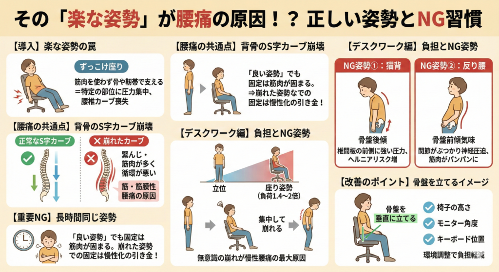 - 腰痛を悪化させる「NG姿勢」に共通する特徴