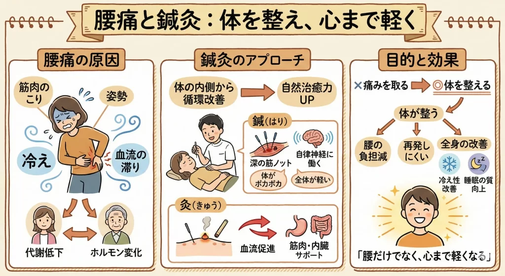 鍼灸の目的は”痛みを取ること”ではなく、”体を整えること”です。体が整えば、自然と腰への負担が減り、痛みも再発しにくくなります。さらに、冷え性や睡眠の質の改善など、全身のコンディションにも良い変化が期待できます。「腰だけでなく、心まで軽くなる」──それが鍼灸の魅力です。