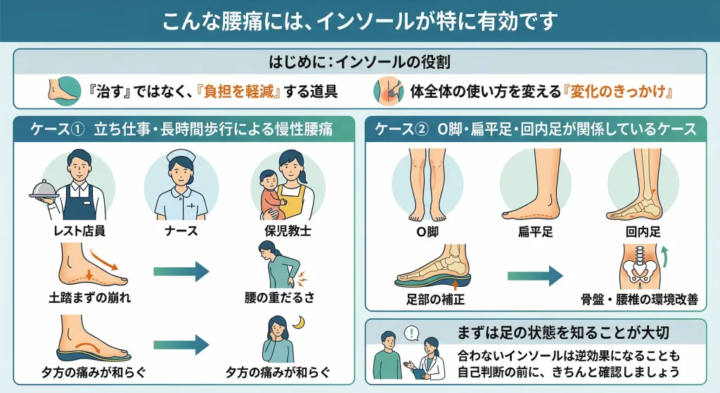 インソールが腰痛に効くと言っても、すべての腰痛に同じように作用するわけではありません。どんな状態の方に、どんな場面で効果が出やすいのか——そこを整理しておくことで、「自分には合いそうか」という判断がしやすくなります。これまで多くの患者さんを診てきた中で見えてきた、インソールが特に力を発揮しやすいケースをお伝えします。